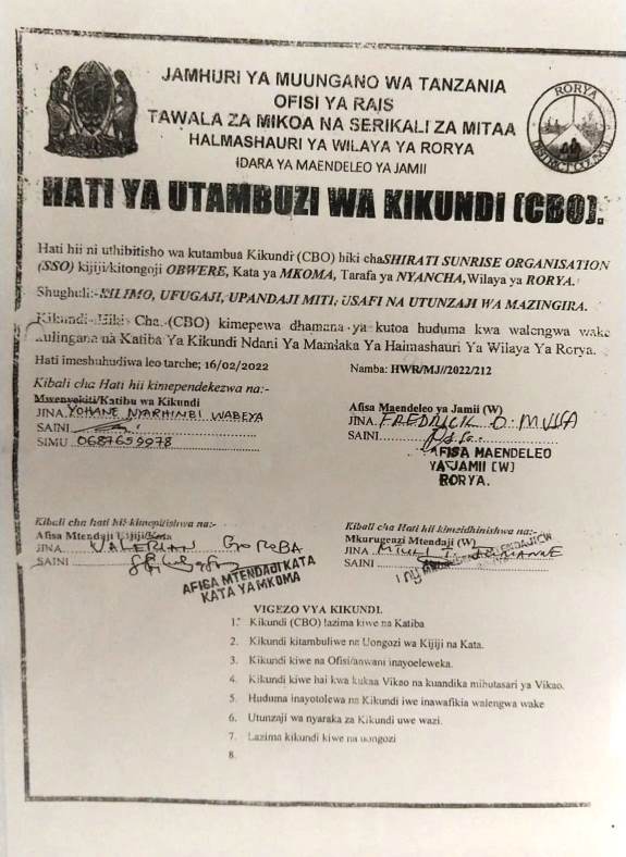 Shirati SUNRISE is a community based organisation operating in Rorya district with the registration No.HWR/MJ/2022/212 The organisation was founded by the vision bearer and his four co-founders in 2022 and established in Mara Region at Rorya district and got its official registration and recognition in 2022 under the Council of Rorya